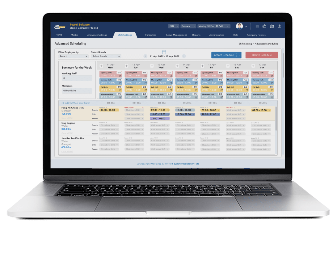 View employee leave requests directly and link schedules with Info-Tech’s payroll software to easily calculate salaries, bonuses, overtime, and more.